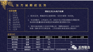 为了筹集到更大的资金,东方城集团还发布了东方城期权,该期权投资金额门槛极高,分为八个层次最低为一万元最高达到1亿元,该期权还有有市场推广收益和相应级别的分红,在2020年时东方城宣称在纽交所成功上市股票代码为DFCT,被纳入纳斯达克综合指数股票代码为DFCC,不过从网上搜索并未搜索到这两支股票。