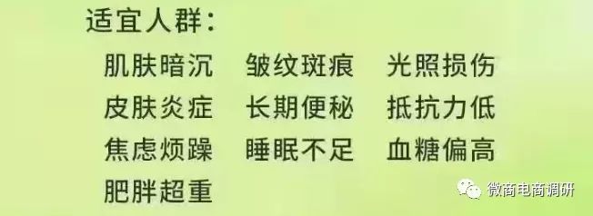 还有宣传材料指出了该产品的适用人群范围,包括长期便秘人群、肥胖超重人群、抵抗力低人群、血糖偏高人群和皮肤炎症人群等。
