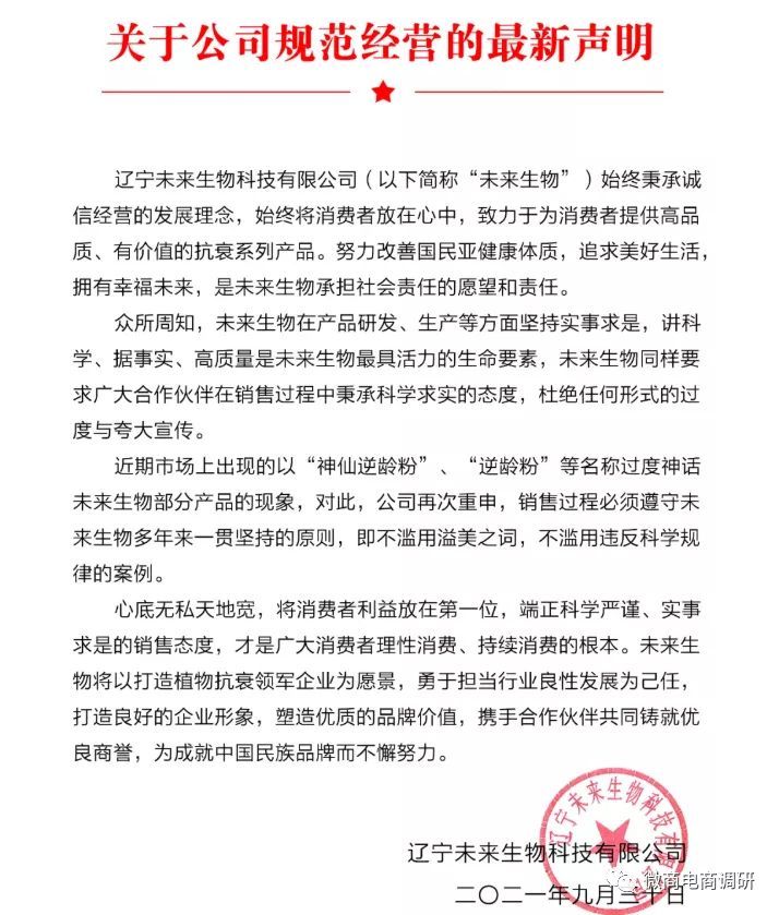 2021年9月30日,未来生物新零售官方发布《关于公司规范经营的最新声明》,《声明》指出:近期市场上出现了以“神仙逆龄粉”、“逆龄粉”等名称过度神话未来生物部分产品的现象,对此,公司再次重申,销售过程必须遵守未来生物多年来一贯坚持的原则,即不滥用溢美之词,不滥用违反科学规律的案例。尽管《声明》明确要求经销商禁止虚假宣传有关产品的功效,然而,进入2021年10月之后,涉及到相关产品的虚假宣传之音在网上仍显得十分刺耳。据了解,《声明》中提到的“逆龄粉”的真实名称为“SUDOKU玉米胚芽粉”,这款产品也是目前未来生物新零售商城中的报单产品。