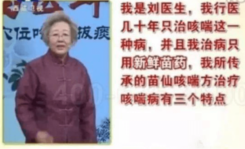 可笑的是,就在同一个电视台,另一个时间段,刘洪斌换了身衣服,又卖起了“苗医鲜药”。不过这次她又多了一个更加唬人的头衔——中华中医医学会镇咳副会长兼东方咳嗽研究院副院长。