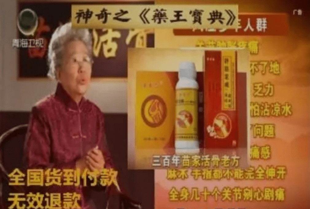 接着她又转战青海卫视,推销起祖传三百年的“苗家活骨方”,让人哪里痛就抹哪里,无效全退款,言语诚恳,一副为患者着想的观世音形象。