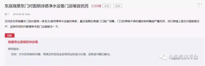 对于朗诗德,网友们除了在产品质量、售后服务与营销模式方面存在质疑外,还有网友在领导留言板上投诉“朗诗德净水设备门店噪音扰民”,对此,张掖市公安局甘州分局回复道:“你好,针对你反映的问题,我局及时安排金安苑派出所进行处理,目前该问题已解决。”