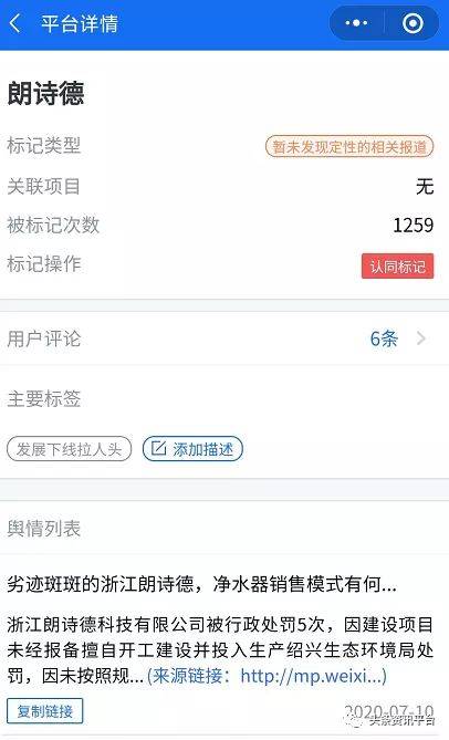 在腾讯灵鲲金融风险监管平台上,“朗诗德”这个关键词也已被标记了1259次。虽然标记类型是“暂未发现定性的相关报道”,不过其主要标签有“发展下线拉人头”的字样。