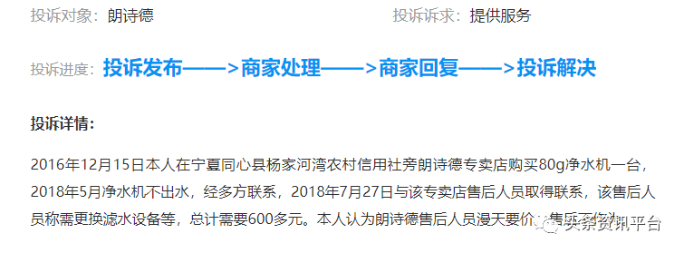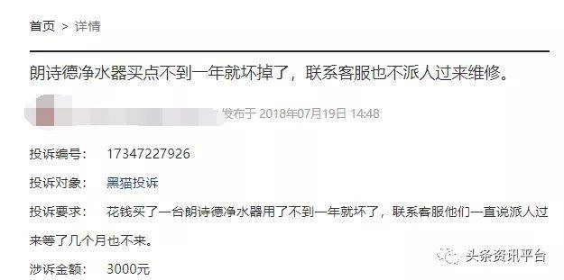 在黑猫投诉网站上,网友王先生投诉称:“朗诗德净水器用了不到一年就坏了,联系客服他们一直说派人维修等了几个月也没人管”。