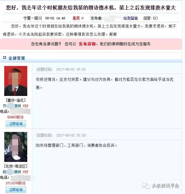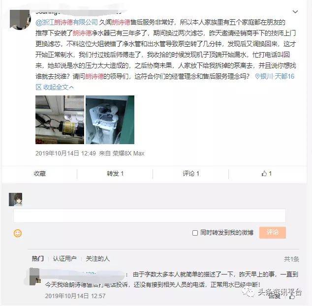 在微博上,也有用户反映:“久闻朗诗德售后服务非常好,所以本人家族里有五个家庭都在朋友的推荐下安装了朗诗德净水器已有三年多了,期间换过两次滤芯,昨天邀请经销商手下的技师上门更换滤芯,不料这位大姐装错了净水管和出水管导致泵空转了几分钟,发现后又调换回来,这才开始正常制水,我们付过钱后师傅走了,我收拾的时候发现机子顶端开始漏水,忙打电话叫回来,她却说是水的压力太大造成的,之后协商未果,人家放下给我拆掉的泵离去,并且说你想找谁就去找谁。请问朗诗德的领导们,这符合你们的经营理念和售后服务理念吗?”