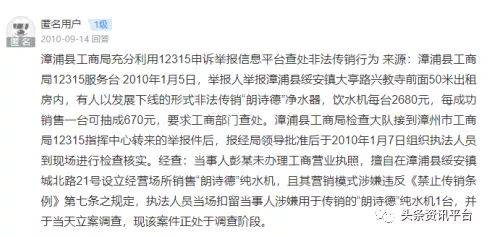 当时,在天涯社区等网站上,就有许多咨询朗诗德产品的提问,在众多回答当中,有这样一条信息颇为引人注意,有人回复称:2010年1月5日,举报人举报漳浦县绥安镇大亭路兴教寺前面50米出租房内,有人以发展下线的形式非法传销“朗诗德”净水器,饮水机每台2680元,每成功销售一台可抽成670元,要求工商部门查处。漳浦县工商局检查大队接到漳州市工商局12315指挥中心转来的举报件后,报经局领导批准后于2010年1月7日组织执法人员到现场进行检查核实。经查,当事人彭某未办理工商营业执照,擅自在漳浦县绥安镇城北路21号设立经营场所销售“朗诗德”纯水机,且其营销模式涉嫌违反《禁止传销条例》第七条之规定,执法人员当场扣留当事人涉嫌用于传销的“朗诗德”纯水机1台,并于当天立案调查。
