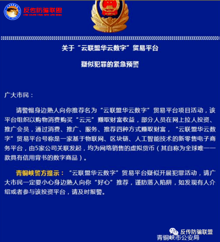 请警惕身边熟人向你推荐名为“云联盟华云数字”贸易平台项目活动,该平台组织以购物消费购买“云元”赚取财富收益,部分人员在网上拉人投资、推广会员,通过消费、推广、服务、推荐四种方式赚取财富,“云联盟华云数字”贸易平台号称是一家基于物联网、区块链、人工智能技术的新零售电子商务平台,由5家公司关联发起,均为网络销售的虚拟货币(其自称为全球唯一一款具有信用背书的数字商品)。