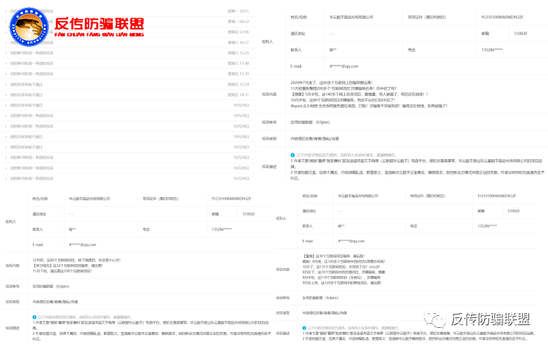 反传防骗联盟曾发布过多篇有关“云联盟华云数字”涉骗平台的曝光文章,近日,该平台的主体运营公司“华云数字商品市场有限公司”对包括反传防骗联盟在内的所有媒介平台进行疯狂投诉攻击,欲达到掩耳盗铃、继续行骗的目的。