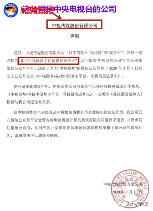 2020年2月10日,央视传媒股份有限公司发布了一则声明澄清“中视圆梦公司与我司无任何股权关系或合作关系”。同时,该声明中还表示“就中视圆梦公司未经我公司授权使用我公司企业标识的违法行为我公司已向微信公众平台运营方深圳市腾讯计算机系统有限公司进行了通告,并要求其注销该公众号,同时亦向北京市朝阳区市场监督管理局举报了该公司的违法行为,请求依法予以调查和处理。”