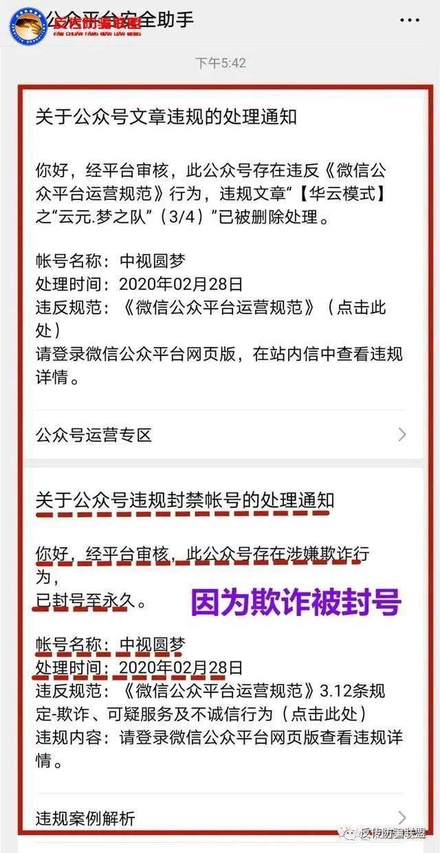 2020年2月28日,云联盟华云数字旗下的公众号之一“中视圆梦”就被腾讯平台封号处理,封号理由是“涉嫌欺诈行为”。