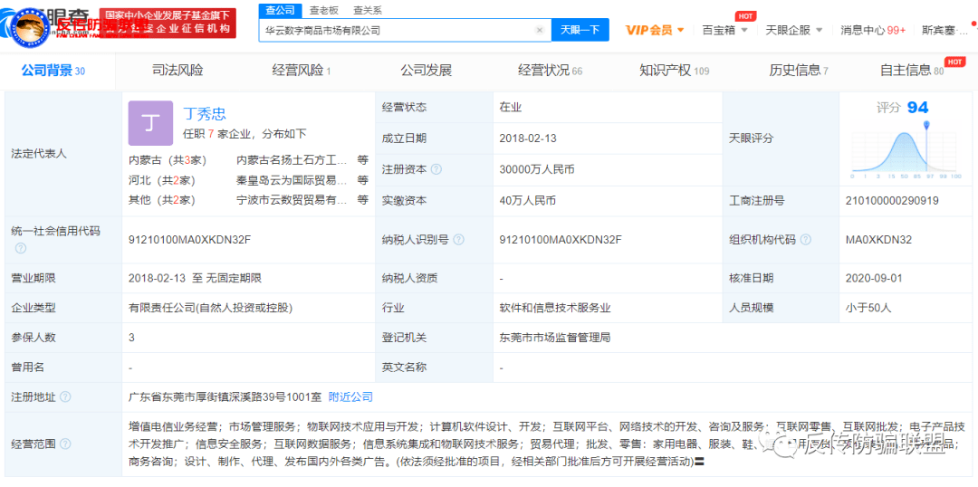 据天眼查显示,华云数字商品市场有限公司成立于2018年2月13日,位于 广东省东莞市厚街镇深溪路39号1001室,注册资本3亿,实缴40万,人员规模小于50人,参保人数3人,法人代表丁秀忠任执行董事,为最大股东,持股60%。