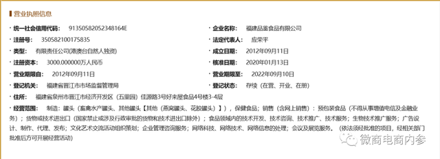 据悉,福建品鉴团队的公司全名为福建品鉴食品有限公司,公司于2012年9月11日成立,注册资本3000万元,实缴不详,法人应荣平,名下还有福建美之颜生物科技有限公司和泉州海川酒业有限公司,主要担任监事职位。