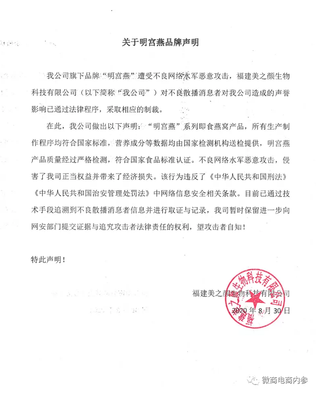 此前,福建美之颜生物科技有限公司就发表过一篇关于明宫燕品牌的声明,主要为解决明宫燕产品本身所遭受的负面信息,声明中表示明宫燕遭受不良网络水军的恶意攻击,其散播不良消息影响到公司声誉,公司将会通过法律程序,对不良散播消息者采取相应的制裁。产品问题倒是解决了,不知道这次的“消费者受骗”事件,公司又会如何应对呢?