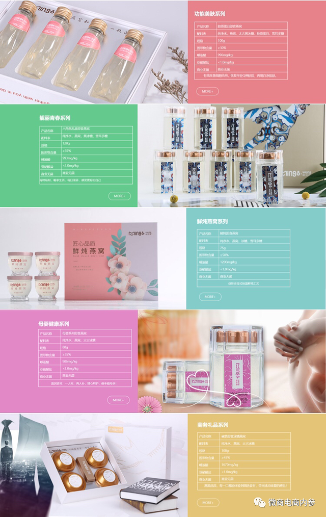 根据公司官网显示,明宫燕的产品一共有功能美肤、靓丽青春、鲜炖燕窝、母婴健康、商务礼品五个系列,分别适用于不同的领域。