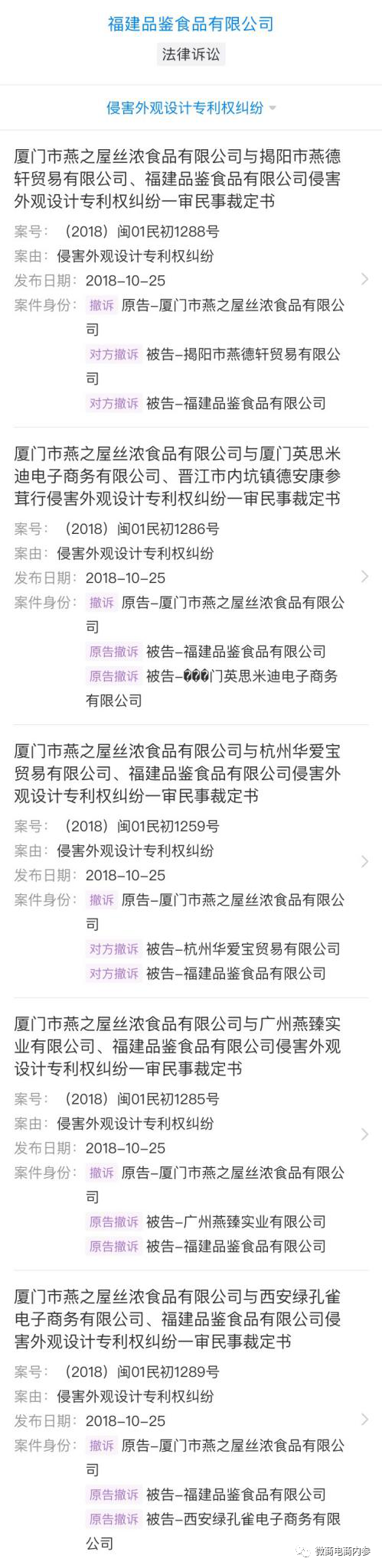 福建品鉴食品有限公司自成立到现在,曾多次作为被告与厦门市燕之屋丝浓食品有限公司就侵害外观设计专利权一事产生纠纷,后经过原告撤诉收尾。