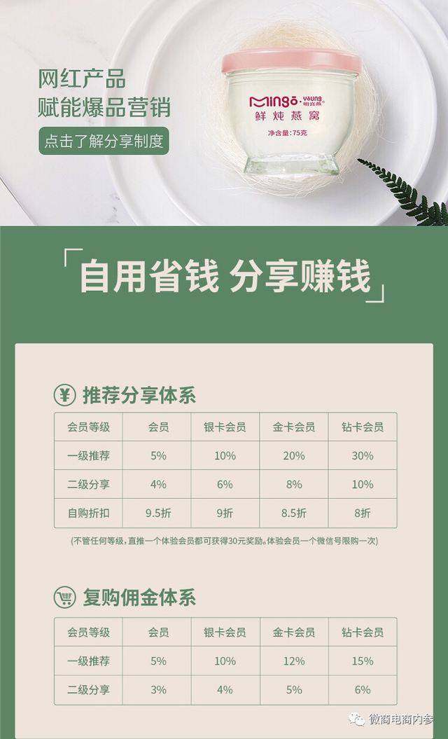另外,该制度拥有推荐分享体系和复购佣金体系,具体如下: