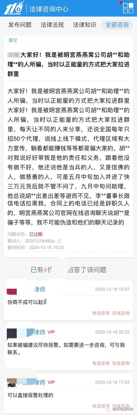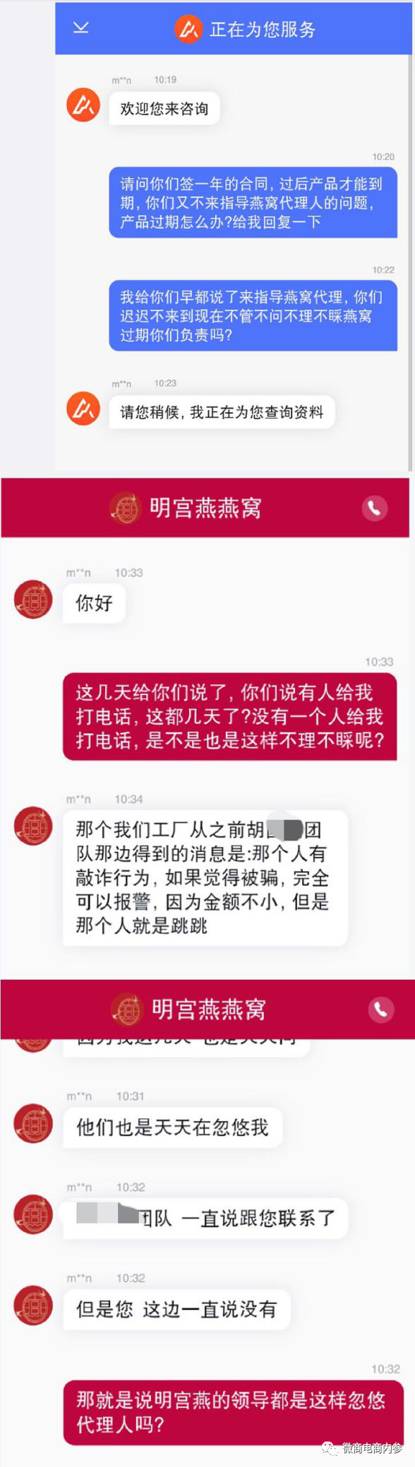 然而就在去年12月,我们看到有消费者在微博发文表示自己被明宫燕的代理团队所骗:当时以正能量的方式把大家拉近群里,每天让不同的人分享,还说每年只招50个代理,有线上线下模式,代理区域还有人大力宣传,躺着都能赚钱等等,结果加入进去拿了3万元货以后就不管不问,询问时以出差等理由搪塞,还将微信电话等拉黑,在明宫燕官网上咨询,对方也将锅甩给当时的代理团队……