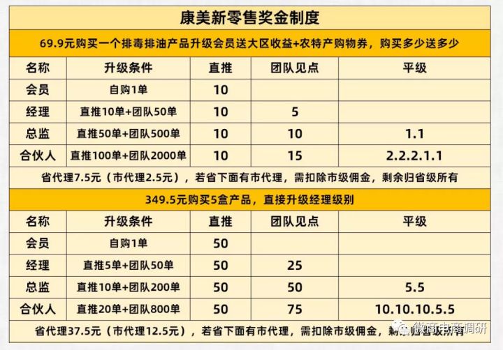 对那些做过微商、直销,或者有经济条件的人,康美新零售平台推出了直接晋级的套餐,花349.5元购买5盒产品,直接晋级到经理级别,此时的直推奖变成了50元,从经理级别开始,团队见点奖分别是25元、50元、75元,平级奖励总监拿两代,每代5元。合伙人的平级奖励向下拿5代,前三代10元,后两代5元。