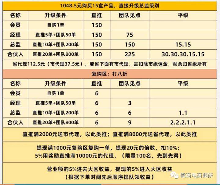 花1048.5购买15盒产品,直接升级总监级别,这是直推奖变成了150元,团队见点奖从经理级别开始拿,依次可以拿到75元、150元、225元。平级奖励总监拿两代,每代15元。合伙人的平级奖励向下拿5代,前三代30元,后两代15元。合伙人还享受复购奖,复购直接打八折。