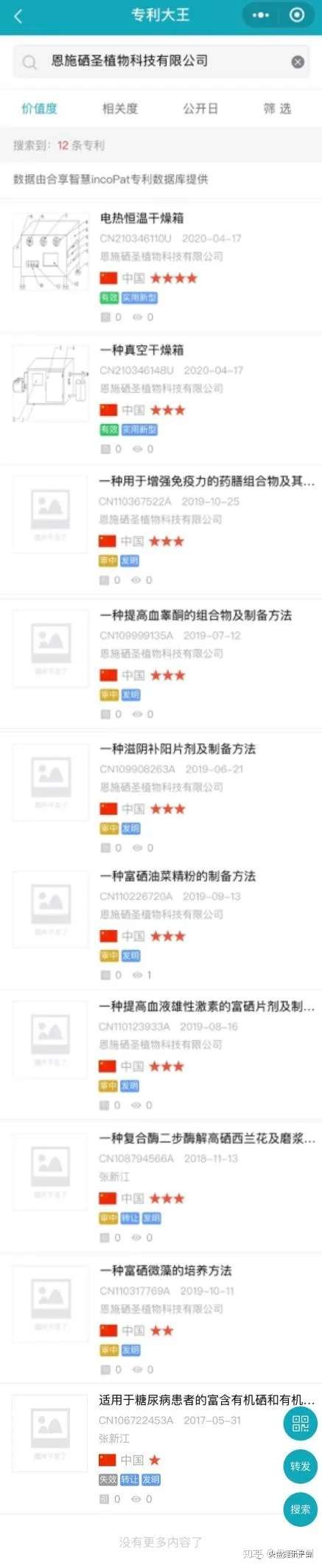 另外,经过查询我们了解到,公司的一系列专利只有电热恒温干燥箱和真空干燥箱设备有效,其余的尚处于审核状态,也就是暂未获得授权,并且对于这些专利的描述大部分都是培养富硒植物的内容,其中一个针对糖尿病患者的专利已经失效。