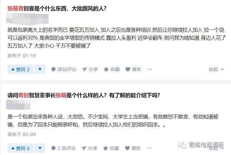 接下来,我们就通过几个网友反馈的内容来了解青创智慧到底遭到了怎样的“声讨”?有匿名网友表示:“(青创)说一个月赚几万几十万的全是营销,有夸大成分,她的学员说收入全是按流水算的,流水下面还有水分,真正并没有挣到多少,对外却宣称月入几万,几十万,误导消费者。不要问我怎么知道的,我也是受害者。”