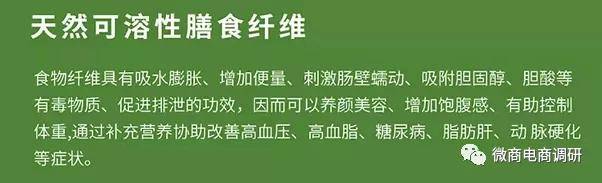 另外,该产品所含有的“天然可溶性膳食纤维”成分还被包装为可以协助改善高血压、高血脂、糖尿病、脂肪肝、动脉硬化等症状。