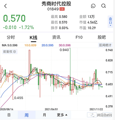 经凹刻观察调查了解,秀商时代(重庆)科技有限公司已被在香港上市的秀商时代控股收购80%的股权,说起上市公司,绝大部分的第一反应就是非常有实力,截至发稿时间,秀商时代控股的换手率非常低,只有0.03%,基本没有多少交易,股票历史最高价也只有0.94港元,现已跌至0.57港元,但凡稍微懂点股市知识的人应该都知道,像这种只是在香港借了个壳上市,股价不高,交易量少的股很多。