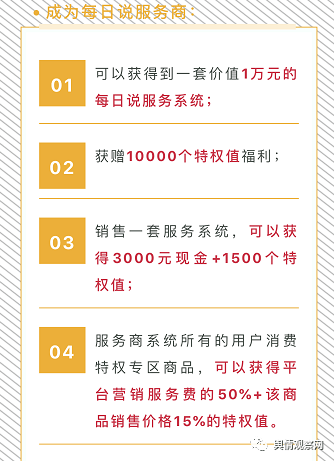 该公司在大力推广每日说APP服务商的政策,交一万元人民币即可成为服务商,同时可获得10000个特权值及4箱白酒,对于做市场的人,每推广一人成为服务商,即可获得3000元现金及1500个特权值,同时服务商以后在平台消费可终生获得相对应的特权值。自2021年10月14日特权值上线以来,打着消费等于赚钱的口号,平台的消费激增,平台也制定了相对了一些套餐及特权值激励,如目前已结束的活动,能获得消费金额1:1的特权值外,还额外赠送特权值,最高可获得5000特权值。