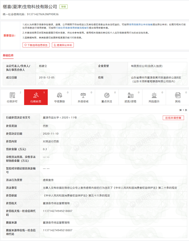 据信用中国显示,该公司因虚假宣传被夏津县市场监督管理局处罚0.3万元。