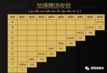 以此类推业绩不断累积所能激活的黄金数量也是不断累加的,每个会员激活的金凤,所加速赠送的是对应的层数进行的,第一层的会员所产生的加速是对第一金凤进行加速,第二层的会员所产生的加速是对会员第二金凤进行加速的,以此类推,第九层是对第九个金凤进行加速。
