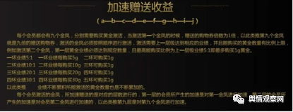 此外,还有加速赠送收益:每个会员都会有九个金凤,分别需要购买黄金激活,当激活第一个金凤的时候,赠送的购物券倍数为1倍,以此类推第九个金凤就是九倍的赠送购物券,激活的金凤必须按照顺序进行激活,激活需要上一层级达到相应的业绩,并且能购买的黄金数量有比例上限例如激活第二个金凤,第一层黄金业绩必须达到规定数量,且最高能购买比例为上一层级业绩5.1即最多购买1g。