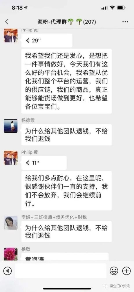 前段时间,一串曝光的聊天记录显示,一家名为海粉宝宝的社交电商平台被公开讨债,大量维权者在微信群喊话平台退钱,平台不仅没有正面回应,还在群内发表一些关于平台“未来可期”的言论试图平息此事,此举更是引起众怒。