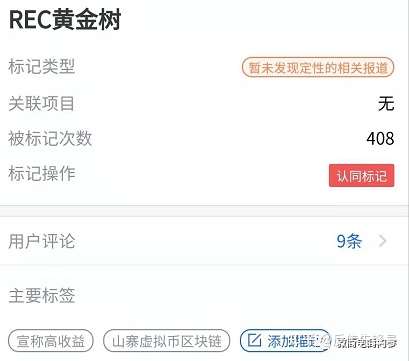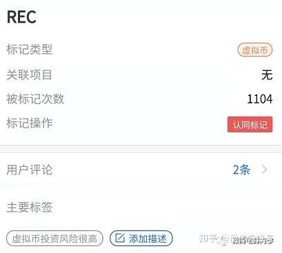 在腾讯灵鲲金融风险监管平台上,“REC”这个关键词已经被标记了1104次,标记类型为“虚拟币”,主要标签有“虚拟币投资风险很高”的字样。