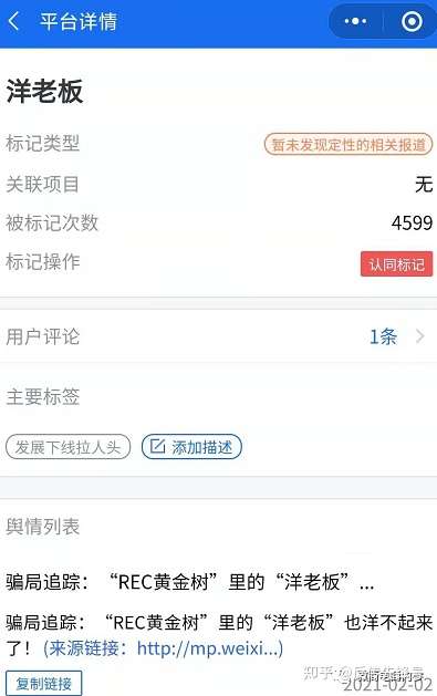 截止2021年3月,“洋老板”在腾讯灵鲲金融风险监管平台上已被标记了4599次,这个次数比所有与REC、黄金树有关的项目的标记次数加起来还要多,该项目对应的主要标签为“发展下线拉人头”。