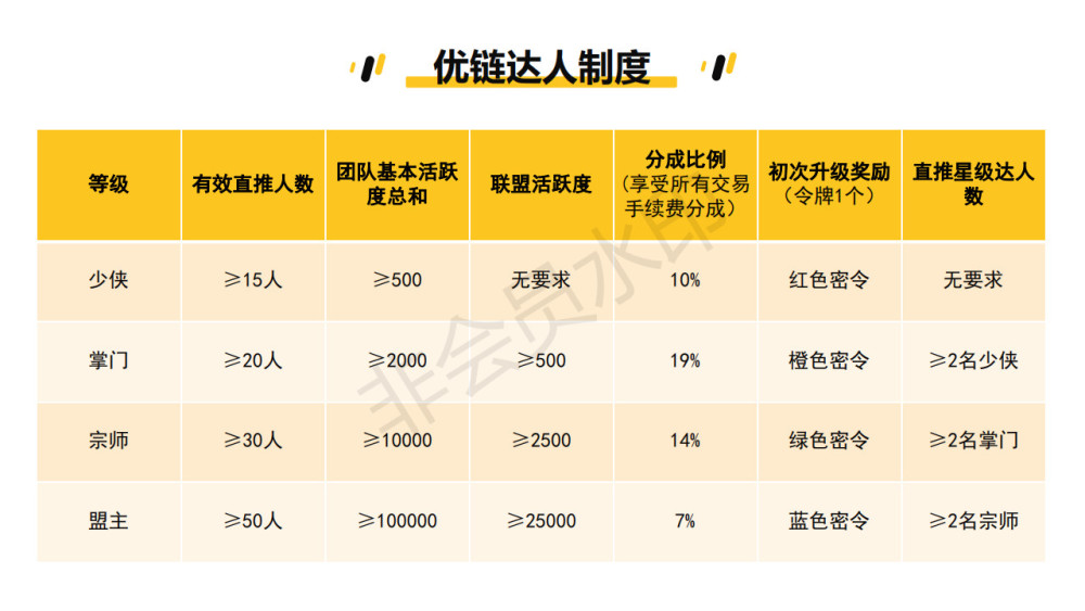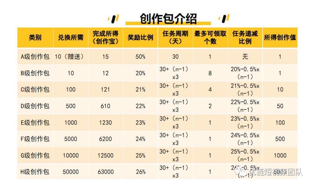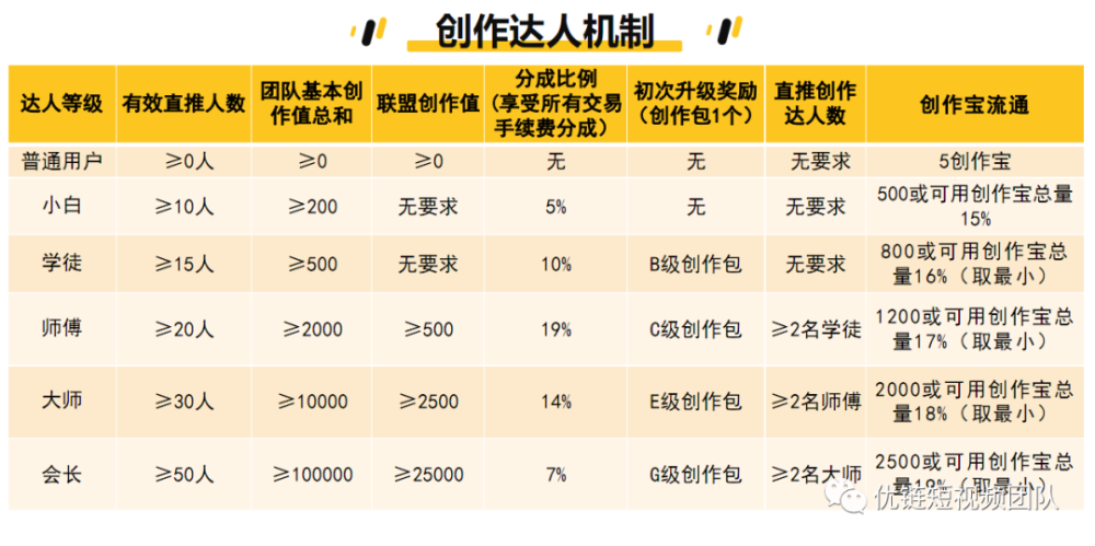 图三为优链达人制度,分为:少侠、掌门、宗师、盟主四个等级;图四为海豹短视频创作达人机制,分为:普通用户、小白、学徒、师傅、大师、会长六个等级。通过对比发现,海豹短视频增加了“普通用户”和“小白”等级,其他四个等级除名称有区别、且海豹短视频进一步细化了规则外,其他方面并无太大区别。