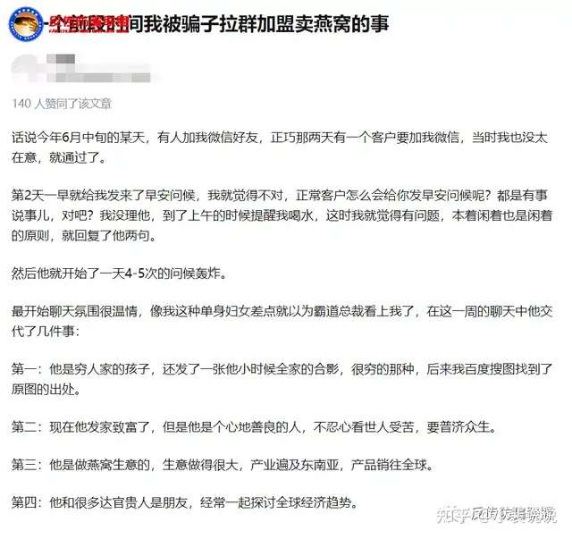 在知乎上,一位用户详细讲述了自己加入所谓的“燕窝加盟招商群”的经历:
