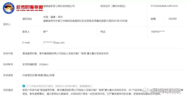 8月27日,反传防骗联盟原创发布了《塑造暖男形象、冒充臻源国际等公司创始人实施诈骗?“某哥”遭大量女性网友投诉》一文,文中公布了大量涉嫌诈骗的公司及人设名单,9月7日,诈骗公司名单中的“福建省新芽心燕科技有限公司”投诉该文导致文章屏蔽。