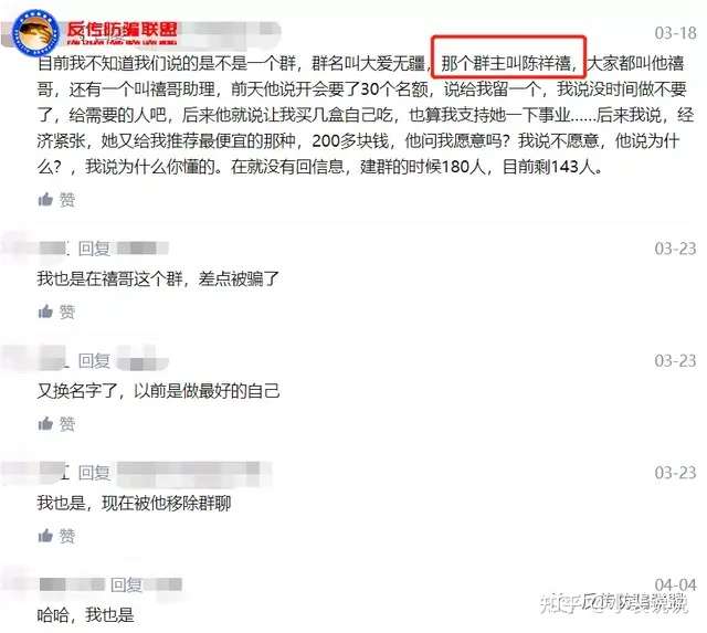 一位用户在该文下面留言:“不知道我们说的是不是同一个群,群名叫大爱无疆,群主叫陈祥禧,大家都叫他禧哥,还有一个叫禧哥助理,前天他说开会要了30个名额,说给我留一个,我说没时间做不要了,给需要的人吧,后来他说让我买几盒自己吃,也算支持一下事业。后来我说经济紧张,他又给我推荐最便宜的,200多块钱,还问我愿意吗?我说不愿意,他问我为什么?我告诉他为什么你懂的,之后他就再也没有回过我信息。”