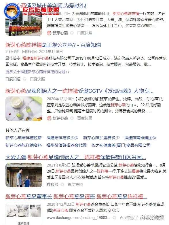 反传防骗联盟留意到,在百度搜索平台,“新芽新燕陈祥禧慰问环卫工人”、“新芽新燕品牌创始人之一陈祥禧探望山区贫困老人”、“新芽心燕品牌创始人之一陈祥禧受邀CCTV《发现品牌》人物专访”等为标题的软文还赫然可见。
