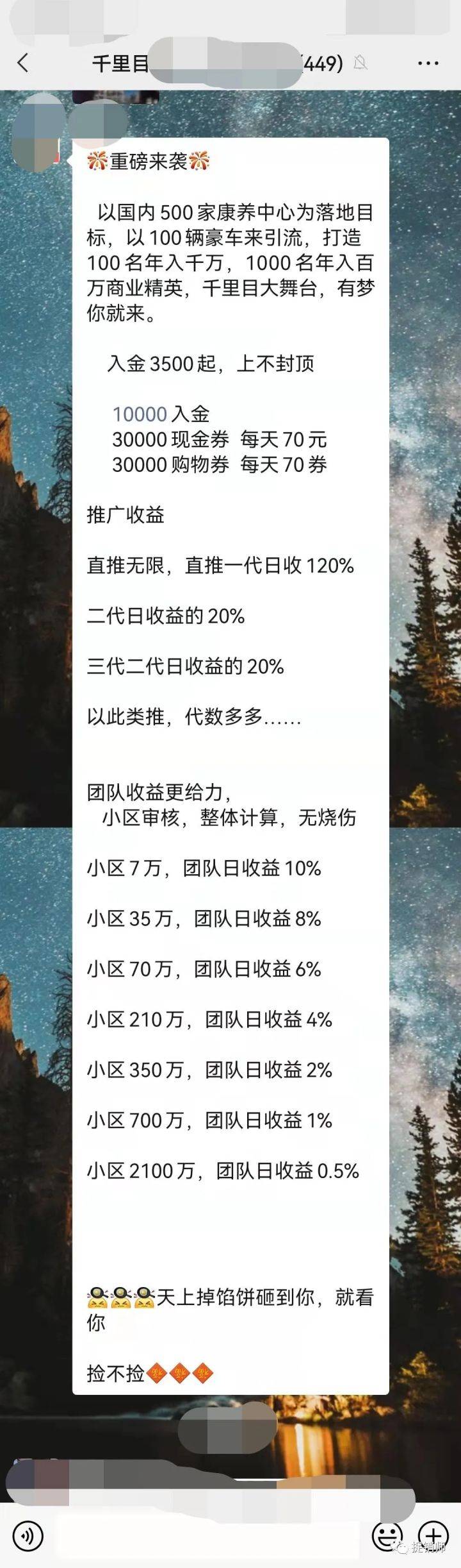 近日,捉销师了解到一个名为“千里目”的项目,据宣传称“以国内500家康养中心为落地目标,以100辆豪车来引流,打造100名年入千万,1000名年入百万商业精英,千里目大舞台,有梦你就来。”