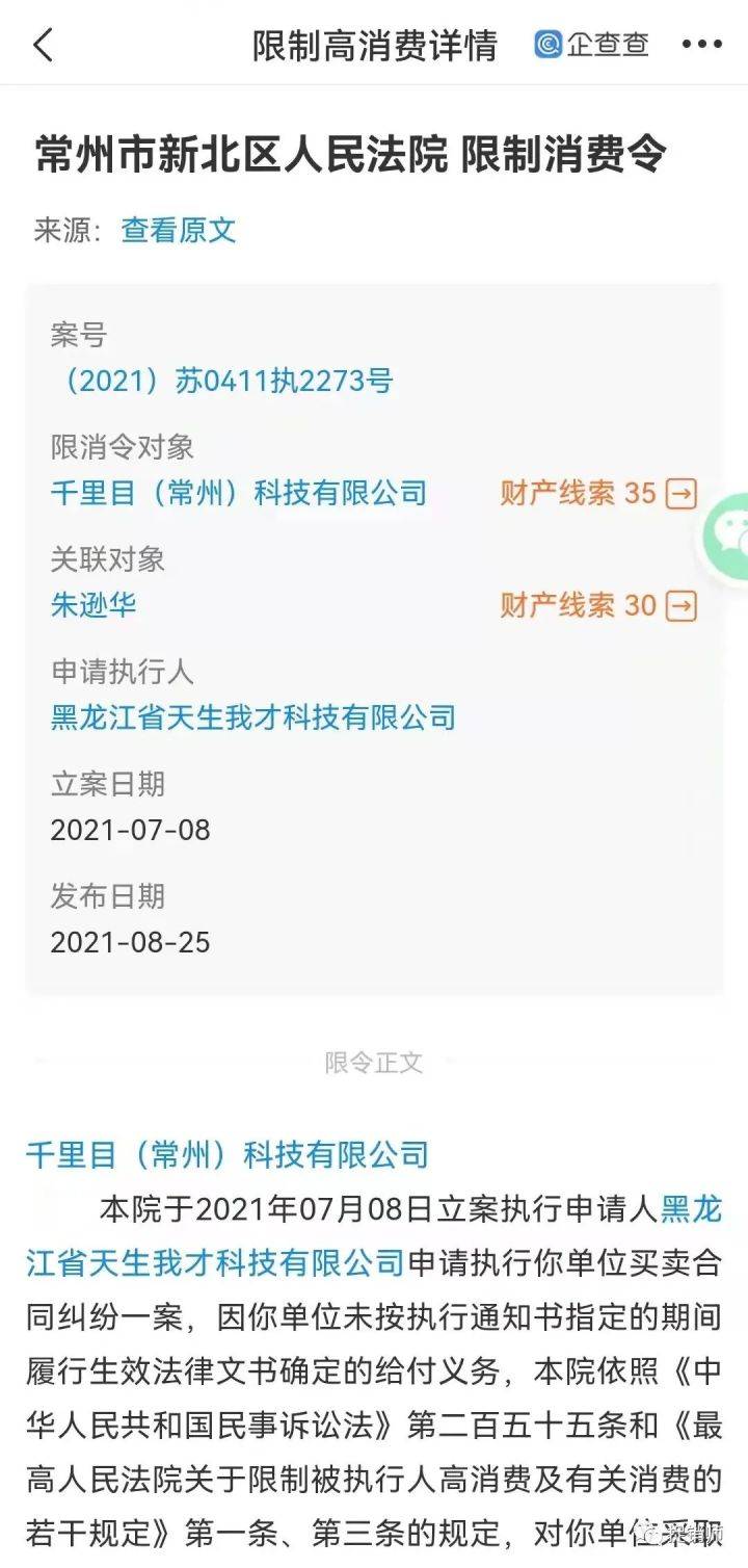 2021年8月25日,千里目(常州)科技有限公司因合同纠纷被限制消费,关联对象朱逊华。