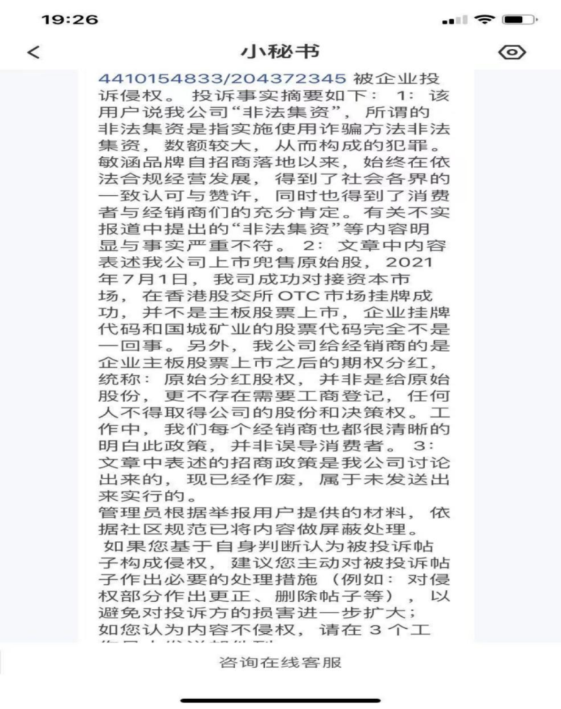 2021年12月6日,清扬君收到某自媒体平台的信息,提醒《敏涵控股【声明】自相矛盾 “原始股分红”岂能随意解读》一文遭到投诉,被投诉理由如下: