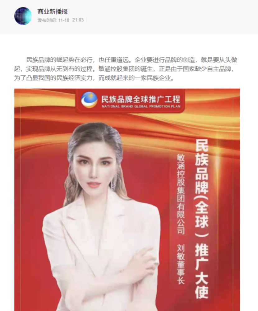 同时,该文章还有敏涵控股集团的刘敏董事长“民族品牌全球推广大使”的宣传海报。