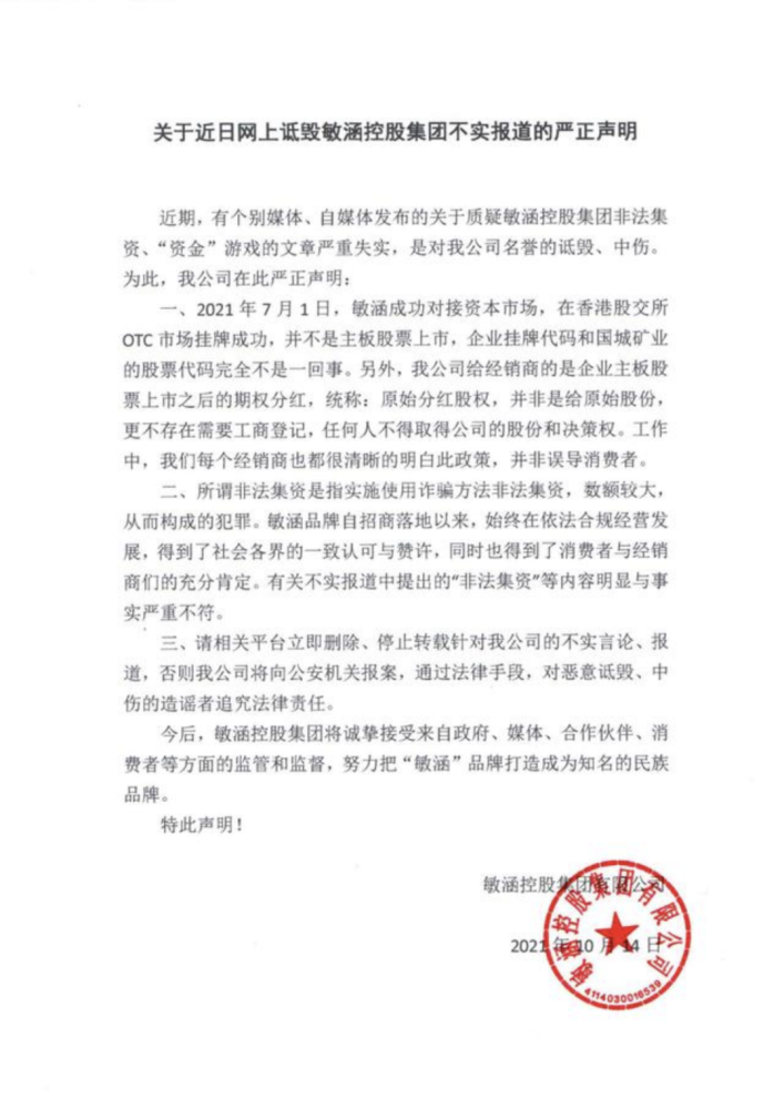 2、文章中内容表述我公司上市兜售原始股,2021年7月1日,我司成功对接资本市场,在香港股交所OTC市场挂牌成功,并不是主板股票上市,企业挂牌代码和国城矿业的股票代码完全不是一回事。另外,我公司给经销商的是企业主板股票上市之后的期权分红,统称:原始分红股权,并非是给原始股份,更不存在需要工商登记,任何人不得取得公司的股份和决策权。工作中,我们每个经销商也都很清晰的明白此政策,并非误导消费者。