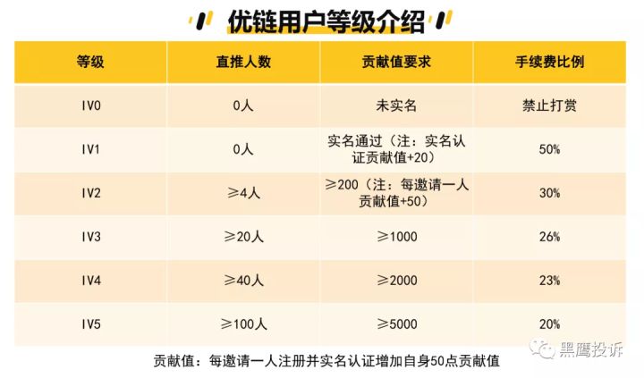 优链用户共分为5个等级,LV2之后需要直推不同的人并要求有不同的活跃度才能升级。