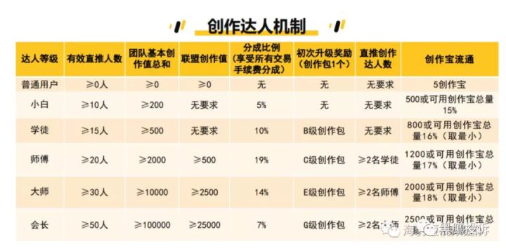 要求:联盟创作值500 (团队总创作值减去 最高的2个 剩下的达到500);所有直推里面有2个是学徒等级。再往上大师会长等级如此类推。