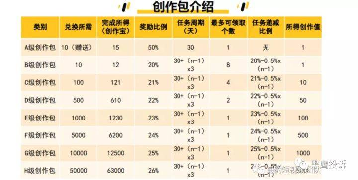 C级创作包:成本100宝(1000元) 周期产出121宝,每天产出4宝。玩法:每天产出4个宝。3天12个的时候去领B级创作包,再够10个的时候再去领B级创作包,手里有1个C级创作包和8个B级创作包。每周期利润37宝。回本周期4个。