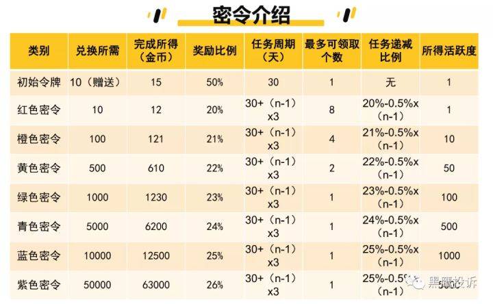 投资10个金币获得一个红色密令,一个周期获得12个金币,收益率20%,获得一个活跃度;投资100个金币获得一个橙色密令,一个周期获得121个金币,收益率21%,获得10个活跃度;投资500个金币获得一个黄色密令,一个周期获得610个金币,收益率22%,获得50个活跃度;投资1000个金币获得一个绿色密令,一个周期获得610个金币,收益率23%,获得100个活跃度;投资5000个金币获得一个青色密令,一个周期获得6200个金币,收益率24%,获得500个活跃度;投资10000个金币获得一个蓝色密令,一个周期获得12500个金币,收益率25%,获得1000个活跃度;投资50000个金币获得一个紫色密令,一个周期获得63000个金币,收益率26%,获得5000个活跃度。(金币需要去其公司搭建或委托的第三方交易平台交易购买,不要拿人民币去兑换。)
