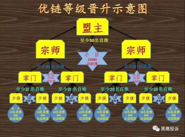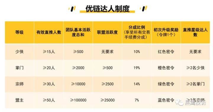 少侠:需要直接推广15人以上,伞下团队活跃度需要大于500,收益是全网交易手续费的10%。(活跃度在静态收益里面可以体现。);掌门:需要直接推广20人以上,伞下团队活跃度需要大于2000,收益是全网交易手续费的19%。这直接推广的20人里面需要有2个升级为少侠才可达成;宗师:需要直接推广30人以上,伞下团队活跃度需要大于10000,收益是全网交易手续费的14%。这直接推广的30人里面需要有2个升级为掌门才可达成;盟主:需要直接推广50人以上,伞下团队活跃度需要大于25000,收益是全网交易手续费的7%。这直接推广的50人里面需要有2个升级为宗师才可达成。