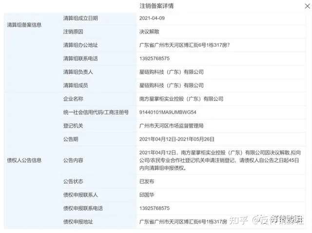 2021年04月12日,南方星掌柜实业控股(广东)有限公司因决议解散,拟向公司/农民专业合作社登记机关申请注销登记,请债权人自公告之日起45日内向清算组申报债权。